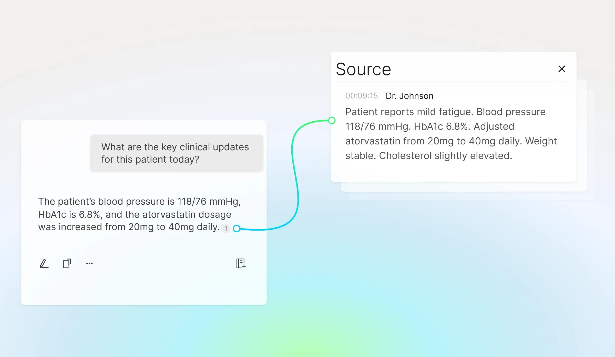 Exportez des résumés structurés pour la création de rapports, partagez-les en toute sécurité avec les équipes de soins et connectez-vous sans effort à votre DME, à votre administration ou à vos outils de flux de travail.