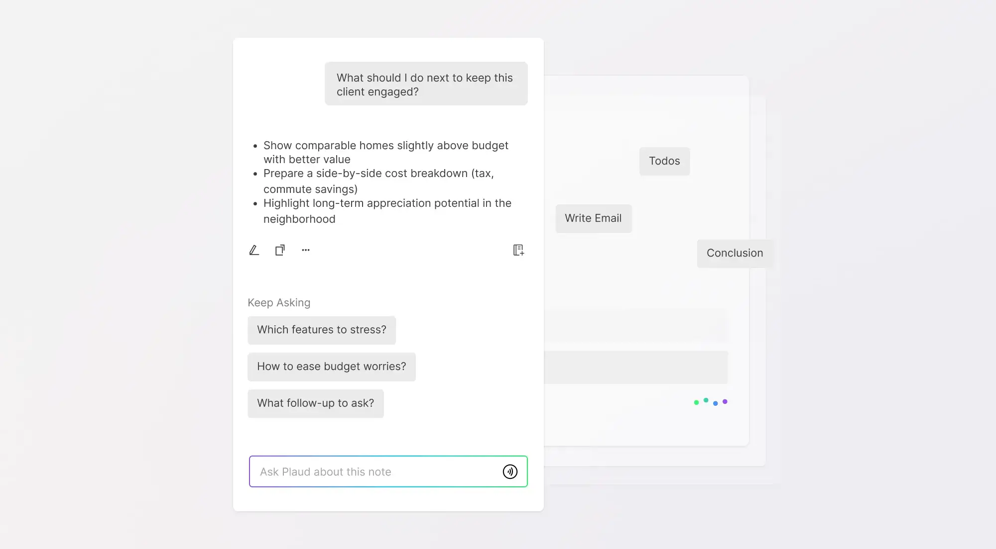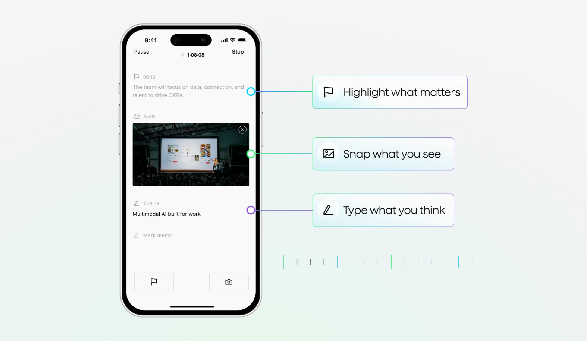 Restez concentré dans la pièce pendant que les conversations sont capturées, traitées et structurées intelligemment avec contexte et nuances.