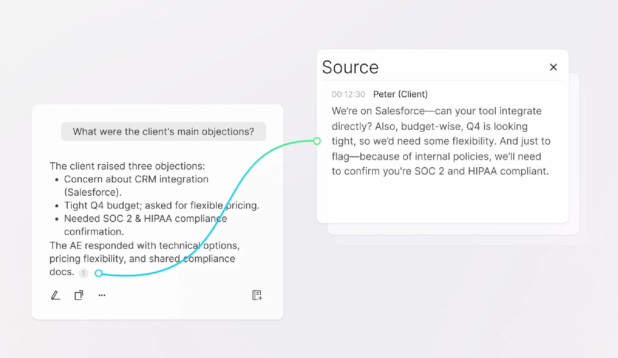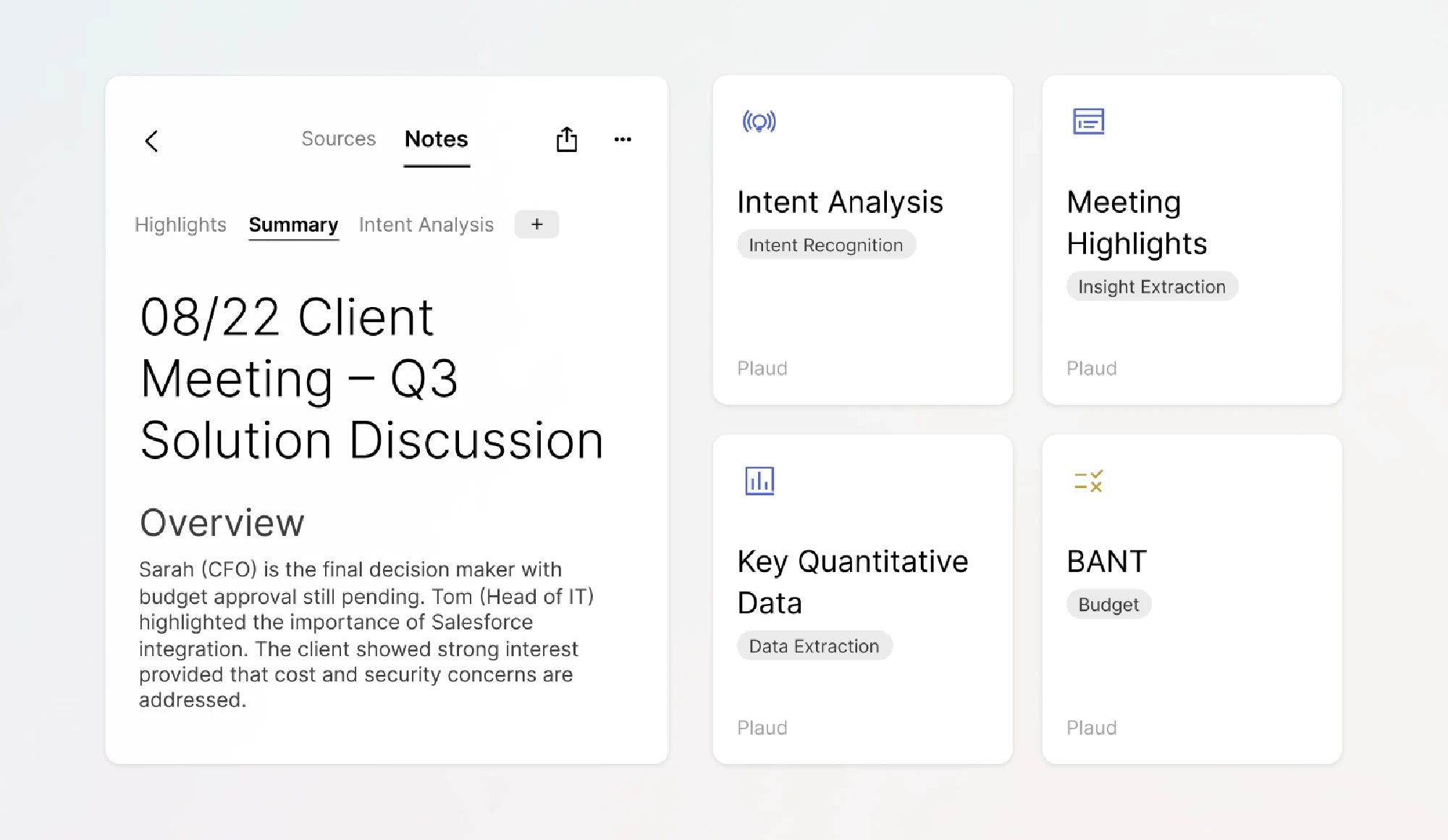 Gardez le pied sur l'accélérateur après les conversations avec des notes, des étapes suivantes et des suivis générés de manière transparente dans vos outils familiers.