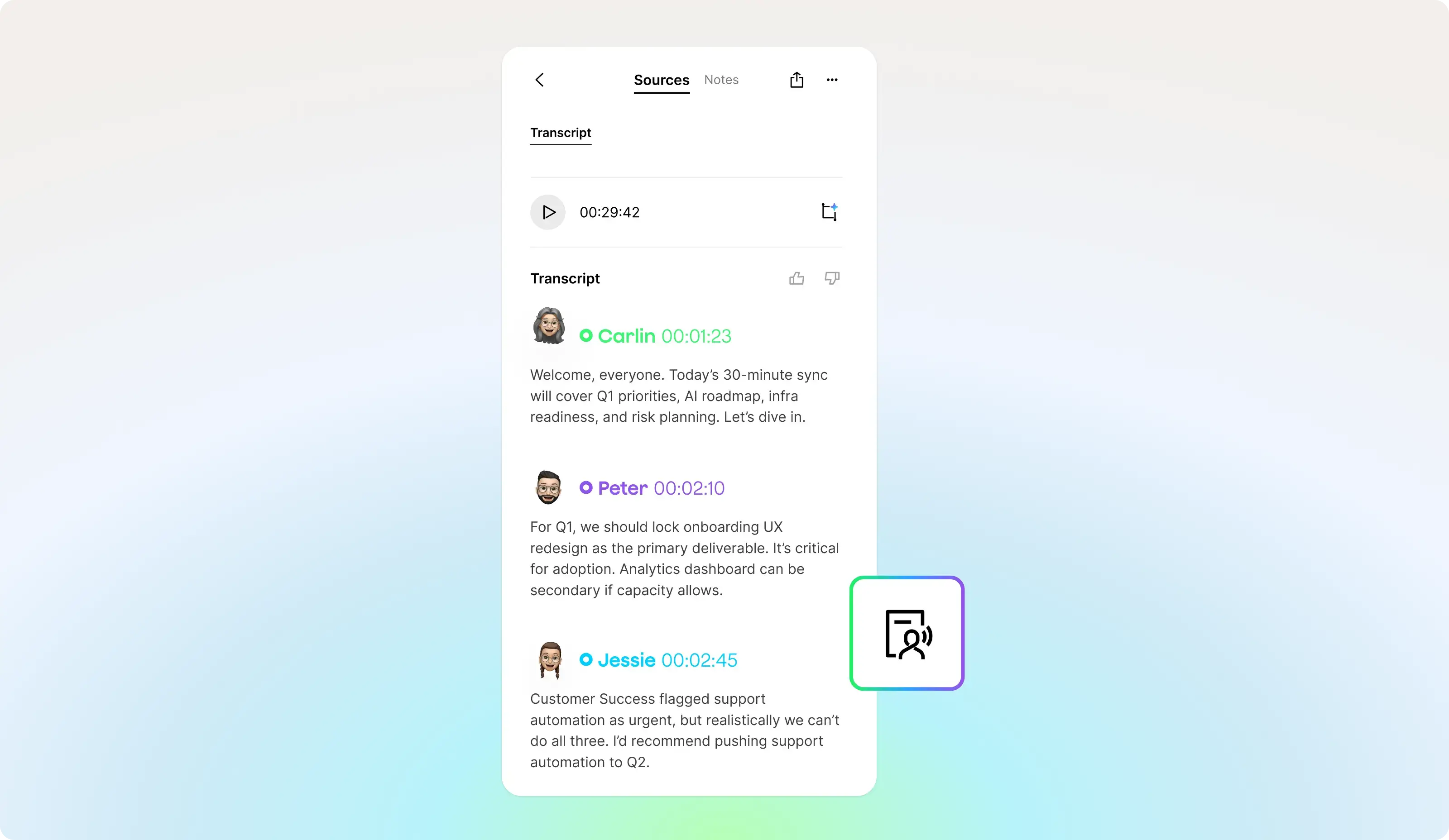 Les visuels se combinent avec l’audio, le texte et les points forts pour créer un contexte plus riche, ce qui donne lieu à des résumés plus complets et à une compréhension plus approfondie de chaque conversation.