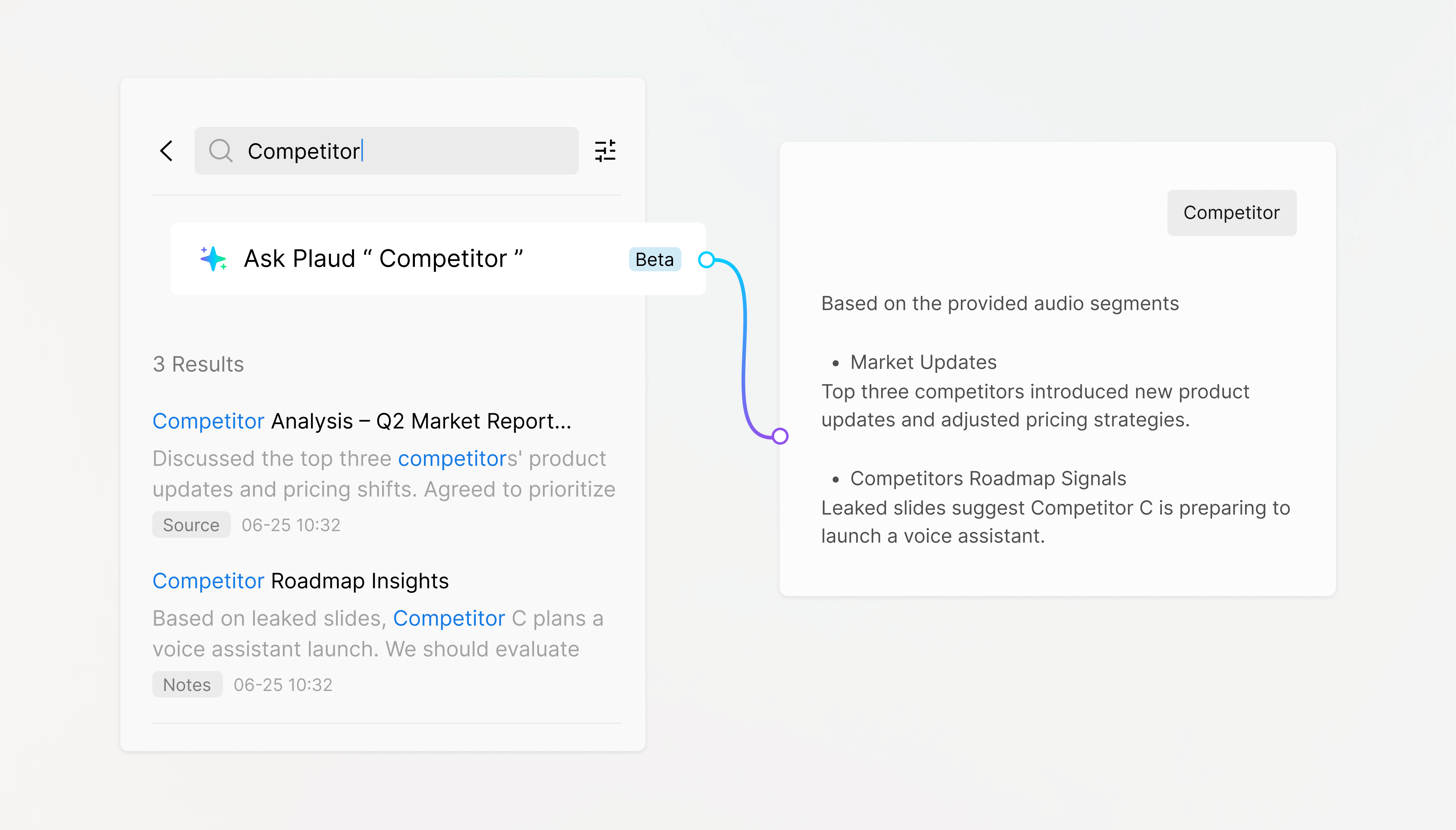 Chacun d'entre eux est basé sur des références et peut être retracé jusqu'à votre audio d'origine, donc Ask Plaud est toujours digne de confiance, précis et exempt d'hallucinations.