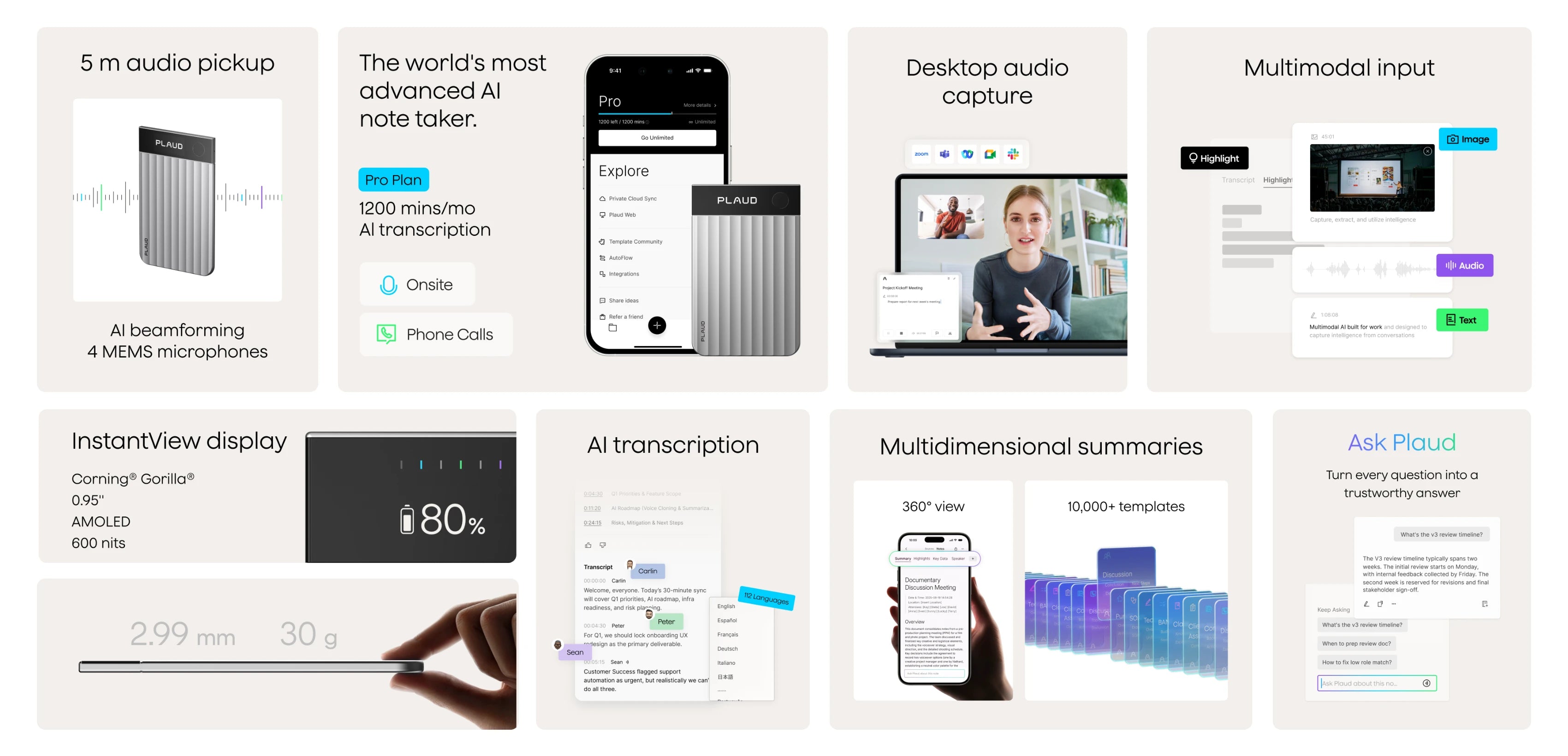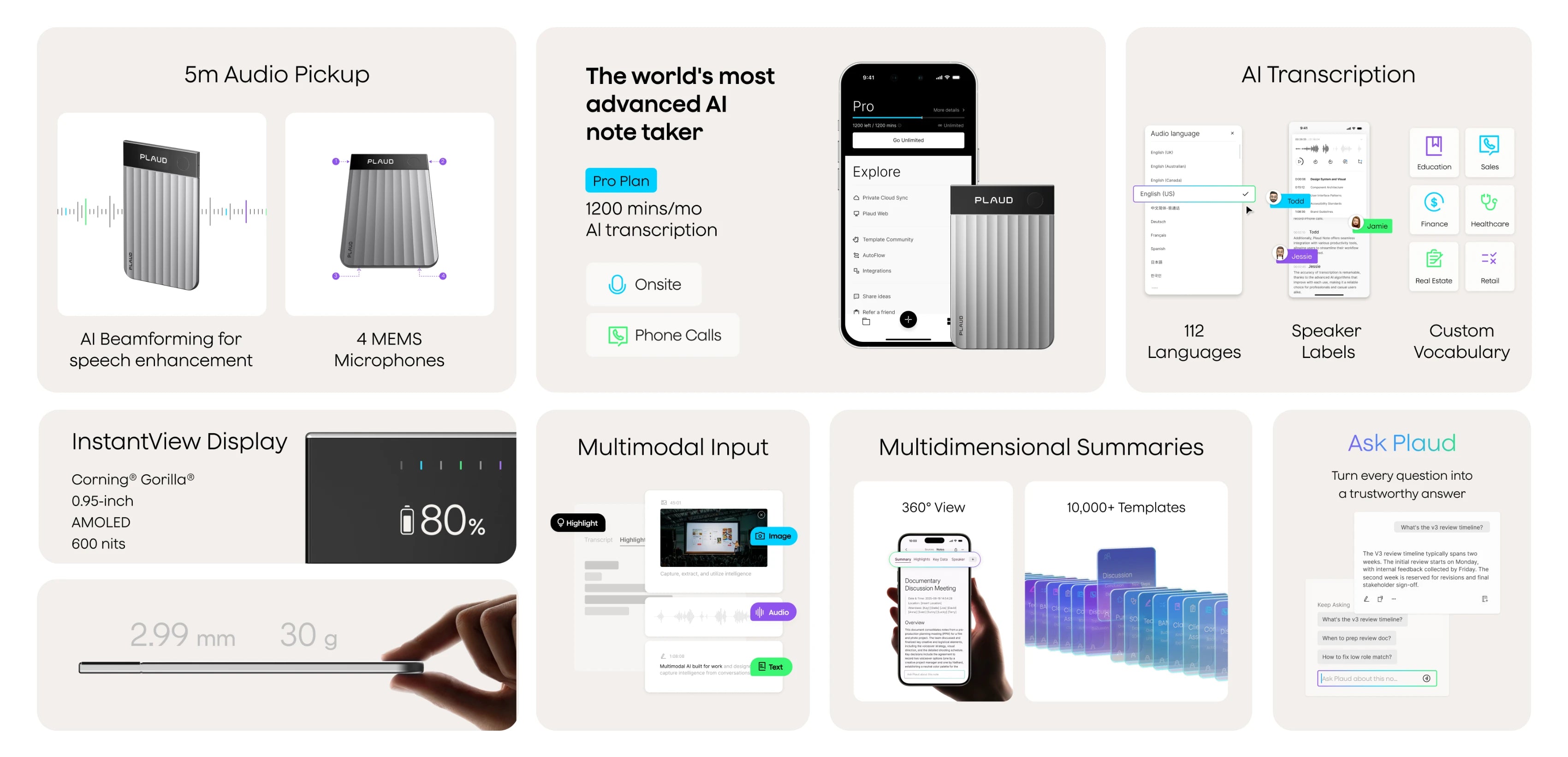 With AI beamforming, Plaud Note Pro captures crystal-clear voices from up to 5 metres, so every word is preserved in detail.